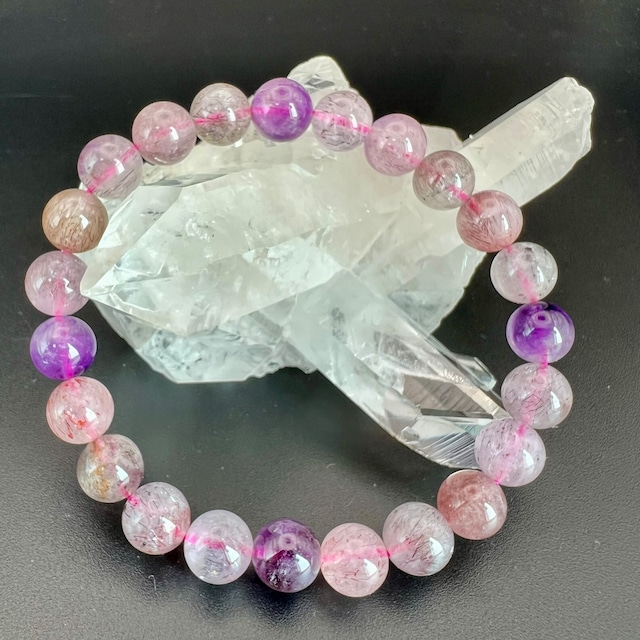 スーパーセブンの中でも一番人気のあるミックスタイプです。 この個体はミルキーで優しい色合いのスーパーセブンです。 レピドクロサイトやゲーサイトの内包量も良く、アメジストの発色も◎です。 パワーストーン界で圧倒的な人気を誇るスーパーセブンですが、最近更にびっくりするほど価格が上昇中で、 ハナビ、ファイヤー、ブラックなどのレアスーパーセブンは軽く数十万を超えてくる有様です。 セブンの入門編にはちょうどよい価格帯だと思いますので、ぜひこの機会にスーパーセブンを押さえてください。 ■ スーパーセブンとは 水晶・アメジスト・スモーキークォーツに、カコクセナイト・ルチル・ゲーサイト・レピドクロサイトが内包された鉱物の通称名で、ビーズに全ての鉱物が内包することはまずあり得ませんが、7つの鉱物が内包された状態の原石をカットし、加工した石もスーパーセブンと呼ばれます。 数あるパワーストーンの中でも最強クラスのエネルギーを持つといわれ、 浄化が必要ない、自己浄化できる類稀な石、とも言われています。 様々な鉱物の力を宿しているため、 持ち主の潜在能力を引き出したり、 幸運を強力に引き寄せると言われ、 個性が異なる7つの鉱物が共存していることから、調和の象徴という側面があり、 心と体の不調を改善してバランスを取ったり、 人間関係を円滑にして調和させる力を持つとされています。 ■ スピリチュアルパワー ・様々な全体運気の向上と保護 ・運気の好転、幸運や成功の引き寄せ ・あらゆる調和 ・潜在能力の顕在化 ・エネルギーを高める ・ヒーリング ■ サイズ等 粒径 約8.5㍉ 内径 約17cm (オペロンゴム仕上げ。伸縮性有り) ■ 産地 ブラジル ■ お手入れ/取り扱い注意事項 ・硬度7でそんなに弱くはないですが、衝撃には気をつけてください。 ・直射日光や高音での放置は避けてください。アメジストを含むので退色の可能性があります。 ■ 発送・注文に関する情報や注意事項 ・ご注文後、3日以内に発送いたします。 ・ネコポス(クロネコゆうパケット)での発送となります。 ■ その他の情報や注意事項 ・当店は全て一点物です。写真の商品をお届けします。 ・撮影で使われている水晶クラスターは付属しません。 ・サイズ直しは縮小のみ可。(サイズアップで他の石をトップに…等のカスタムオーダーは別途お問い合わせください) ・ご質問やご相談がある場合は、ショップのお問い合わせからお願いいたします。