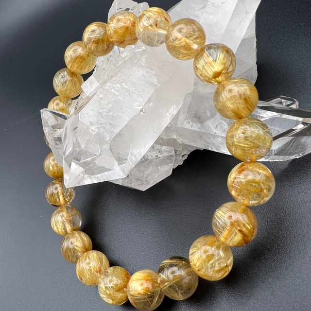 ゴールドルチルクォーツは金色の鮮やかさ・針の太さ・水晶のクリア度で値段が決まりますが、 今回仕入れ分は金色の輝き、水晶のクリア度、粒径ともにご納得頂けるクオリティだと思います。 一応、最初に私自身が個人的に仕入れ、アルコールテストと水浸しテストで一切の色落ちが無く、天然のルチルであることをテスト確認したのち、3本のブレスの仕入れを行っております。 仕入れた3本のうち2本はカスタムオーダーをいただきましたので、最後の一本となります。 幸運をキャッチする効果が高いとされる、キラキラと発色の良いアンテナが沢山入っているアンテナゴールドルチル、 守護作用が強いとされる、天使の髪の毛が入っていると言われる上品なエンジェルヘアールチル、 どちらもびっちりとルチルが入っていて見ていて飽きないブレスです。 ■ ルチルクォーツについて 水晶の中を縦横無尽に伸びるルチルがアンテナとなり幸運をキャッチするとされ、 不動の人気を誇る、金運・開運において最強かつ万能の効果を持つパワーストーンです。 近年さらに価格が向上し、上質なモノは特に値上がりが激しくなっております。 私自身ルチルクォーツにはたくさん助けられ、信じられないような出来事がいくつも起こりました。 ルチルにはパワーストーンの中でも特に強い効力を感じます。 ■ 効能 金運・成功・開運・直感力や洞察力の向上・邪気祓いなどの守護効果・マイナスエネルギーの遮断・創造力・事業繁栄・勝負強さ ■ サイズ等 粒径 約9.5mm 内径 約17.5cm ■ 産地 ブラジル ■ お手入れ/取り扱い注意事項 ・硬度7で弱い方ではありませんが、衝撃は避けるようにしてください。 ・オペロンゴム4重で仕上げております。(伸縮性ある細い繊維束のゴム。ゴムが切れてしまうときも一気にということはなく、徐々に切れていきます。 ビーズが飛び散りにくく安心です。) ■ 発送・注文に関する情報や注意事項 ・ご入金確認後、3日以内に発送いたします。 ・ネコポス(クロネコゆうパケット)での発送となります。 ■ その他の情報や注意事項 ・当店は全て一点物です。写真の商品をお届けします。 ・撮影で使われている水晶クラスターは付属しません。 ・サイズ直しは縮小のみ可。(サイズアップで他の石をトップに…等のカスタムオーダーは別途お問い合わせください) ・ご質問やご相談がある場合は、ショップのお問い合わせからお願いいたします。 石たちがあなたの深い理解者となり、 優しい波動であなたをサポートし、 あなたが幸運の波に乗って人生の様々な特別な瞬間を迎えるとき、 石たちが傍で彩ってくれることを願っています。
