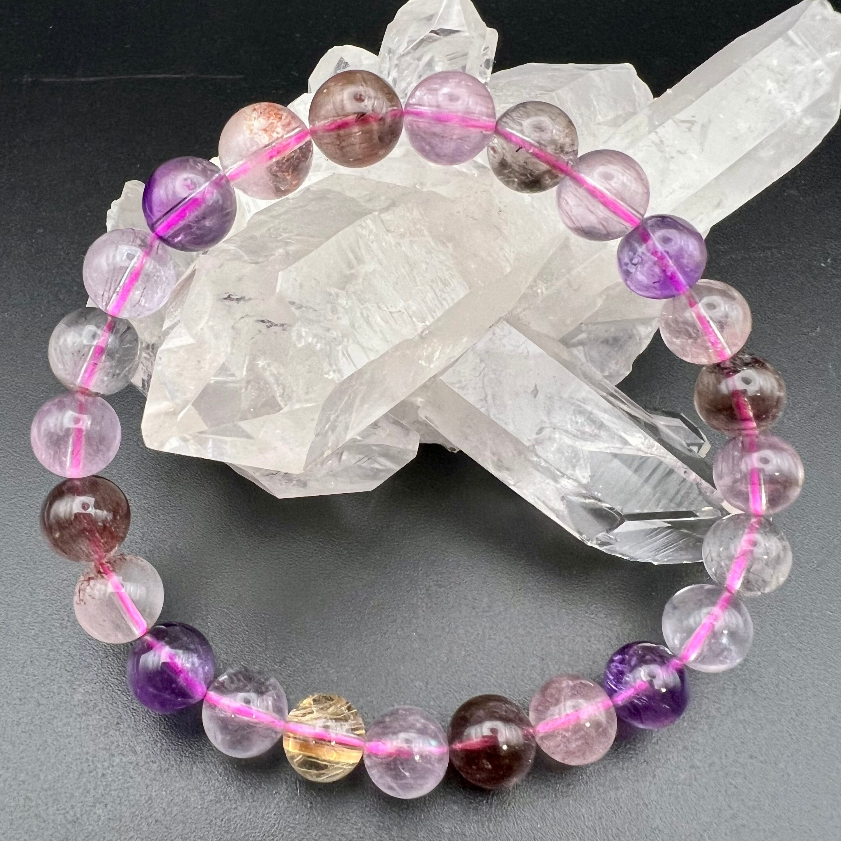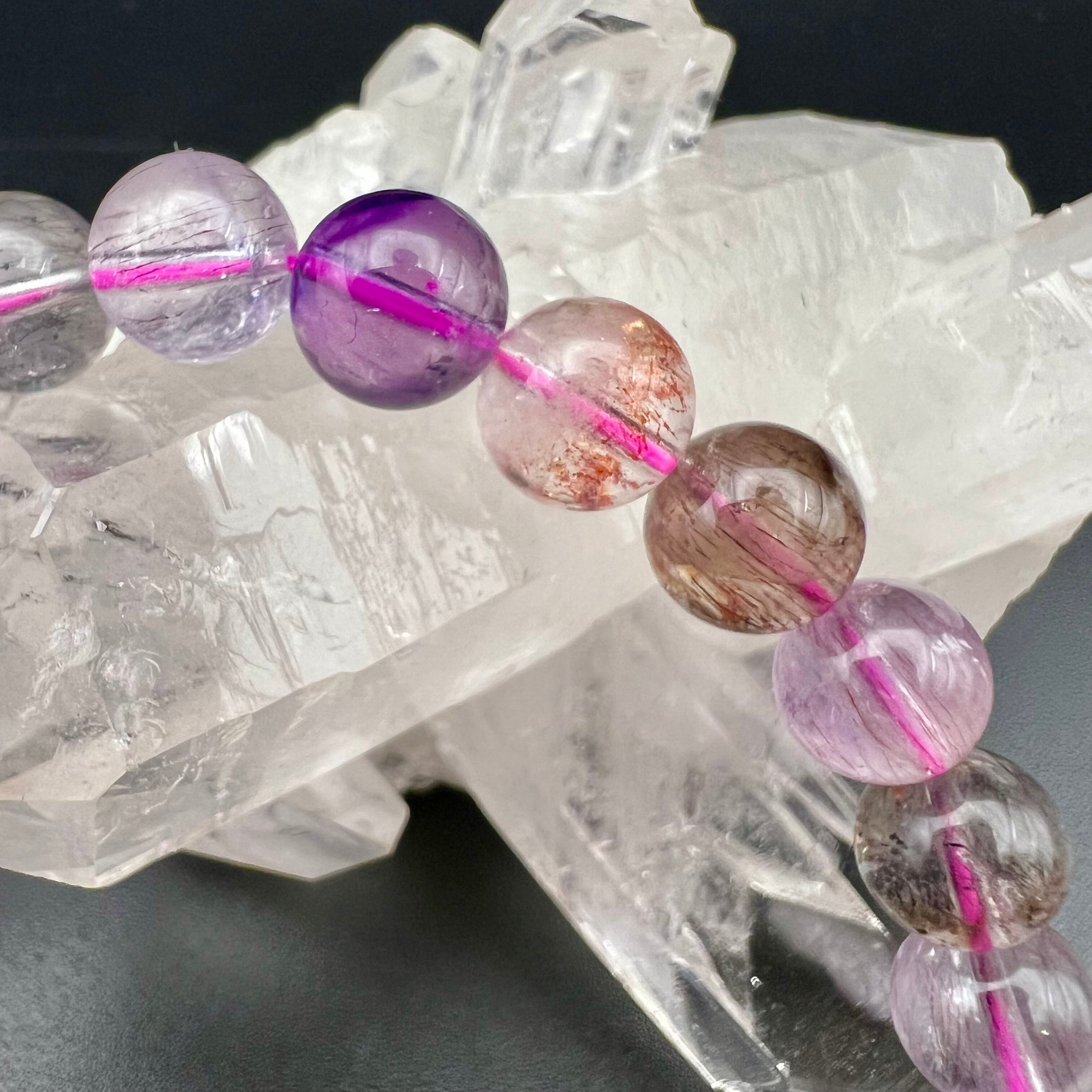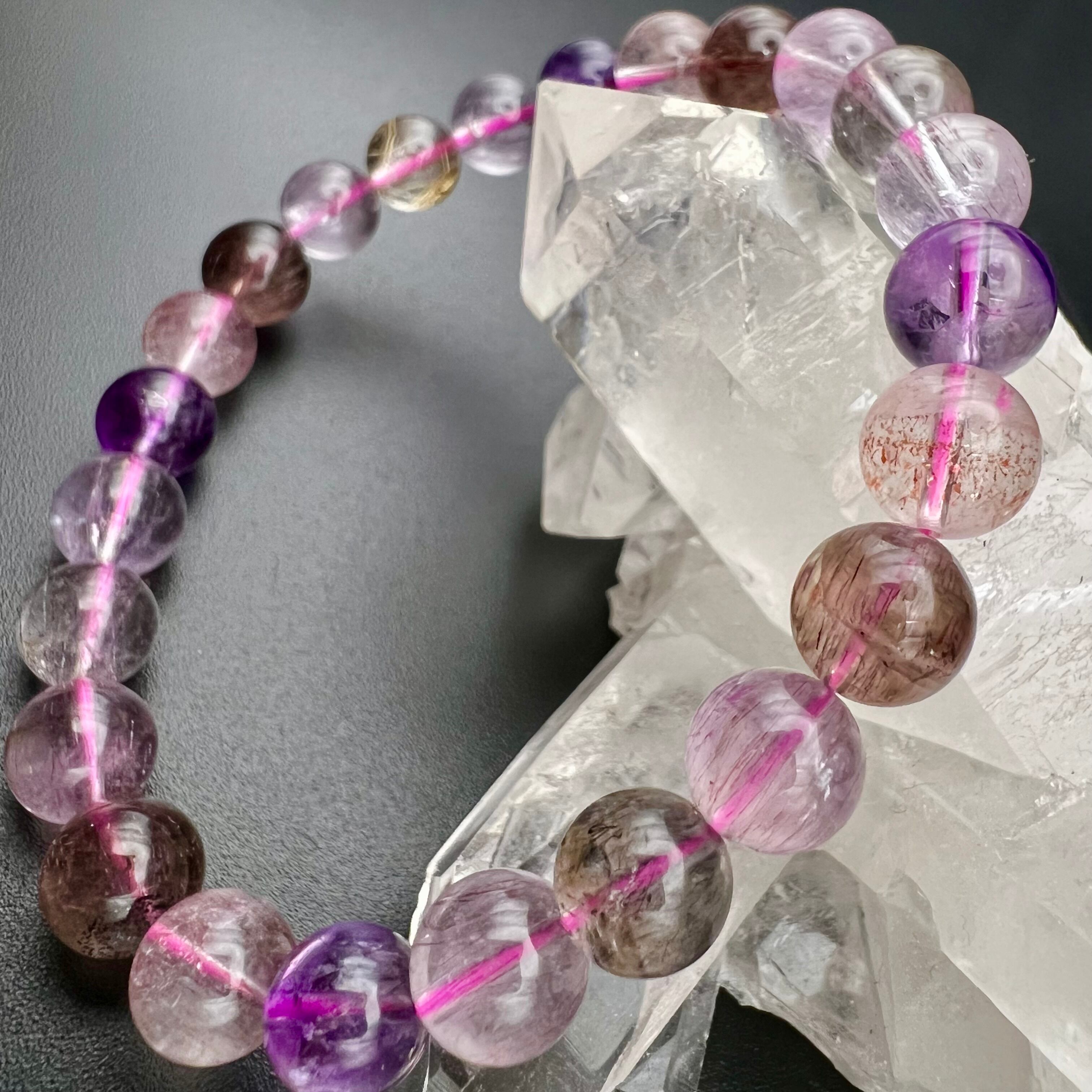 水晶・アメジスト・スモーキークォーツに、カコクセナイト・ルチル・ゲーサイト・レピドクロサイトが内包された鉱物の通称名で、ビーズに全ての鉱物が内包することはまずあり得ませんが、7つの鉱物が内包された状態の原石をカットし、加工した石もスーパーセブンと呼ばれます。