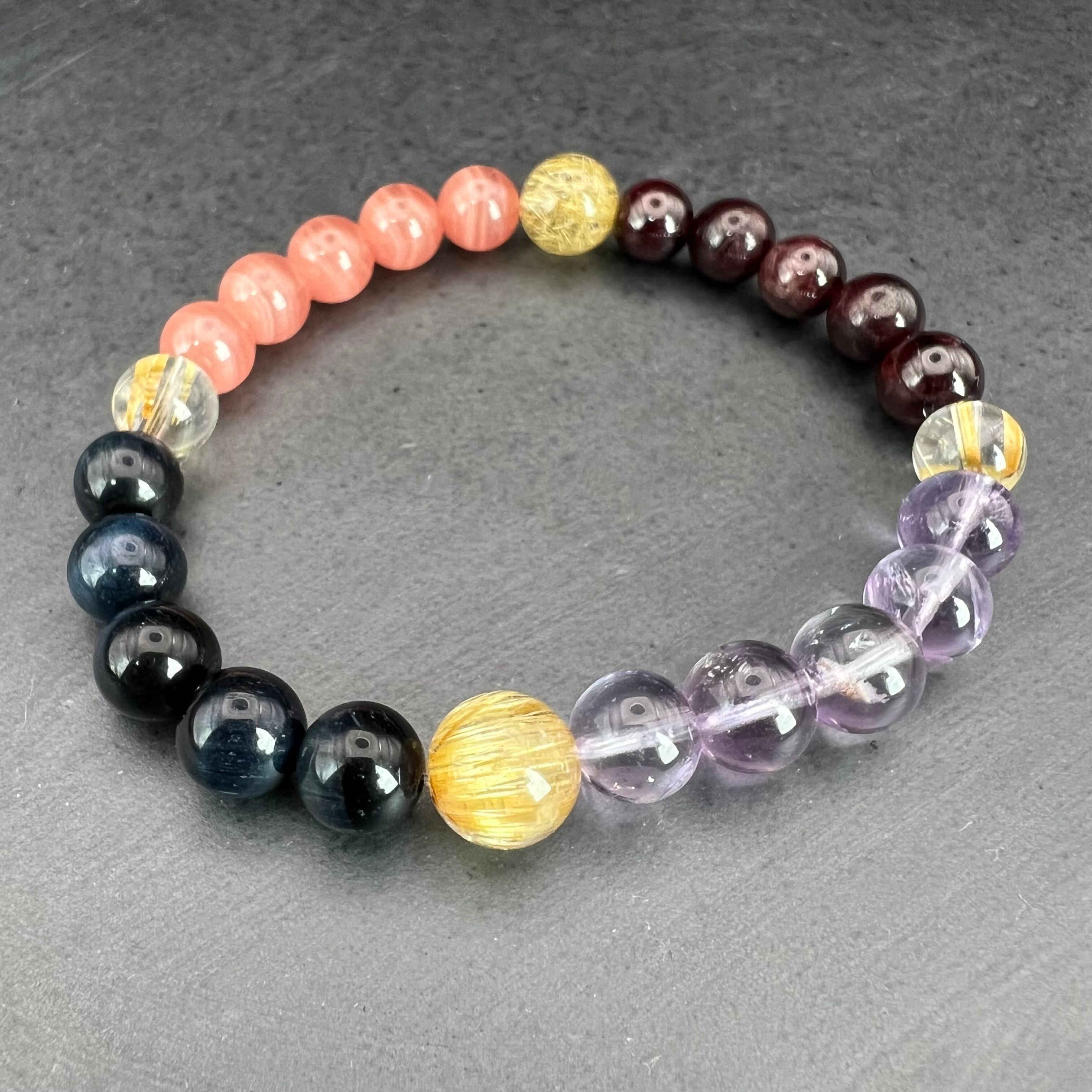 第1チャクラのガーネットと第0チャクラのブルータイガーアイを配置し、チャクラ的なバランスもきちんと設計しました。